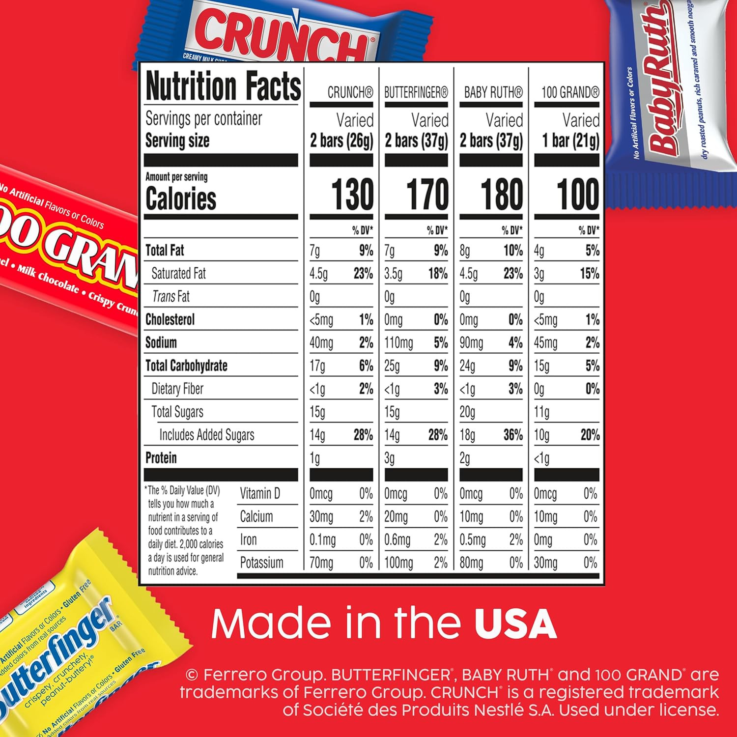 Inside this variety pack, you’ll find a delightful mix of Butterfinger’s crisp, peanut-buttery center, CRUNCH’s crispy rice and creamy milk chocolate, Baby Ruth’s crunchy peanuts, caramel, and nougat, and 100 Grand’s caramel-filled chocolate bar with crispy rice. Whether you're looking for a sweet snack, sharing with friends, or satisfying your chocolate cravings, this assorted candy box has something for everyone!